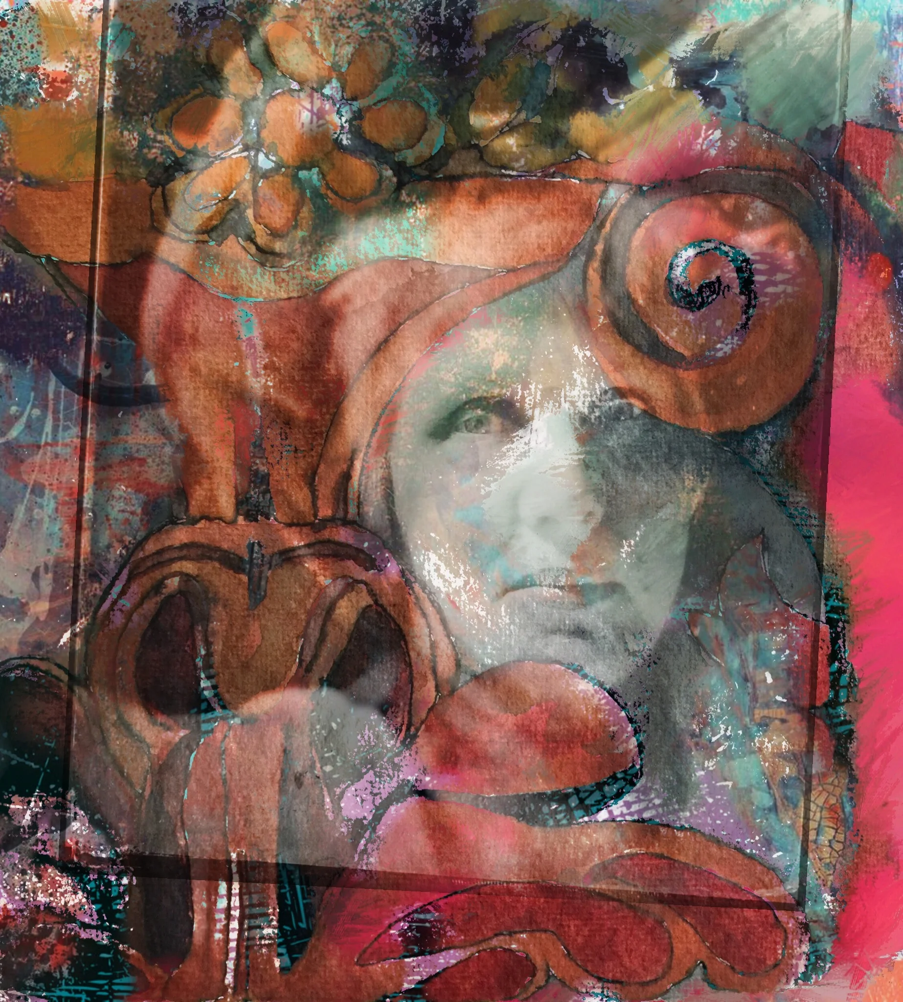“When I’m 64,” is a self-portrait I created just before my 64th birthday. Inspired after a visit to Verve Studio’s current exhibit of Josephine Sacabo’s work, I composed this image. I was particularly moved by seeing Sacabo’s latest work, beautiful color photogravure pieces which Sacabo prints herself. This piece was created digitally by combining an image of one of my paintings with a tintype self portrait. The layers were again adjusted digitally to get the effect you see.